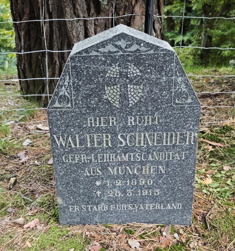 Der Soldat Walter Schneider wurde am 01.02.1890 in der bayerischen Landeshauptstadt München geboren. Er war geprüfter Lehramtskandidat, also angehender Lehrer. Im Ersten Weltkrieg kämpfte er als Fahrer in der 8. Reserve-Artillerie-Munitions-Kolonne der 8. Reserve- Munitions-Kolonnen-Abteilung. Am 28.03.1915 fiel er während der Kämpfe in den Vogesen im Alter von 25 Jahren bei Breitenbach (französisch: Breitenbach-Haut-Rhine).