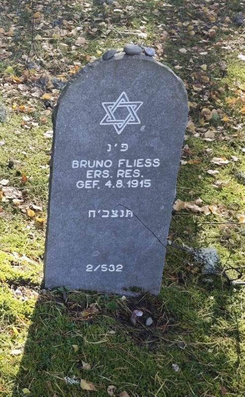 Der jüdische Soldat Bruno Fliess wurde am 03.09.1885 in Altdamm, (seit 1945 polnisch Dąbie (Stettin)) geboren. Im Ersten Weltkrieg kämpfte er als Ersatz-Reservist in der 8. Kompanie des 74. Reserve-Infanterie-Regiments. Am 04.08.1915 fiel er während der Kämpfe nördlich der Stadt Münster (französisch: Munster, elsässisch: Menschter).
