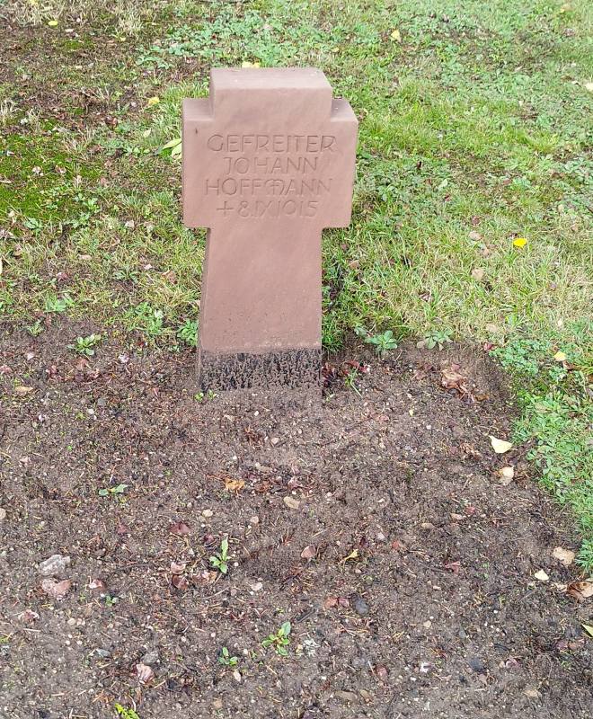 Der Soldat Johann Hoffmann stammte aus der bayerischen Gemeinde Steinbach am Wald. Im Ersten Weltkrieg kämpfte er als Gefreiter in der 7. Kompanie des 23. bayerischen Reserve-Infanterie-Regiments. Am 08.09.1915 fiel er während der Kämpfe in den Vogesen nahe der Stadt Münster (französisch: Munster, elsässisch: Menschter).