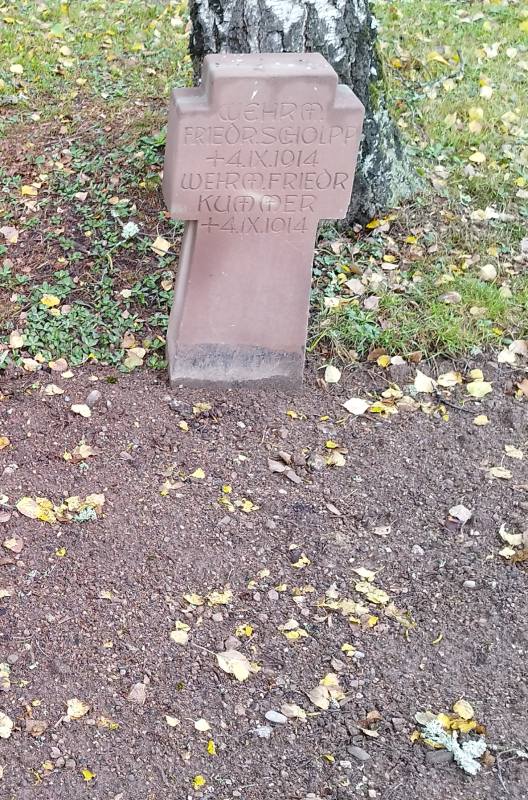 Der Soldat Friedrich Scholpp stammte aus Wangen, einem Stadtteil von Stuttgart, der Landeshauptstadt des heutigen Bundeslandes Baden-Württemberg. Im Ersten Weltkrieg kämpfte er als Wehrmann in der 4. Kompanie des 121. Landwehr-Infanterie-Regiments. Am 04.09.1914 fiel er während der Kämpfe in den Vogesen nahe der Stadt Münster (französisch: Munster, elsässisch: Menschter).