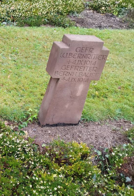 Die Beweggründe zu dieser Entschließung? Jenseits des Großtals, beim Hörnleskopf, Hohrodberg und Hohrod, im bayerischen Abschnitt, schien es nicht nach Wunsch gegangen zu sein. Unsere 6. Kompanie hatte auf ihrer Erkundung nahe bei Hohrod Kampfspuren, ein zerschossenes Geschütz und anderes angetroffen, Bayern nicht. Die auf die Höhe nordwestlich Münster vorgeschiebenen Züge der 6. und 7./L. 121, unsere Artilleriebedeckung, Flankensicherung und Verbindungstruppe nach Norden hatte bis in den Nachmittag nach rechts hinauf Fühlung mit einem bayerischen Unteroffiziersposten im Hof Bergbrochen gehabt, abends war Bergbrochen plötzlich von Franzosen besetzt und dass die Bayern ohne Nachricht abgezogen waren, kostete uns einen Mann, den der Feind aus unserer nächsten Verbindungspatrouille abschloss. Sie waren demnach zurückgegangen, die Franzosen gefolgt, und wenn der Gegner auf den nördlichen Münstertalbergen über Münster vorgekommen war, so beherrschte er unsere Zufahrtsstraße und konnte uns abschneiden. Später hörten wir, dass auch vom Gebweilertal her Alpenjäger mit Gebirgsartillerie gemeldet waren, kurz, es war in unserem Rücken wohl nicht geheuer und was die Einnahme und Wiederaufgabe einiger Berge angeht, so war man damals und im Bewegungskrieg überhaupt nicht überbedenklich. Im dämmernden Morgen stiegen die Bataillone schweigend wieder ins Tal hinab, vorbei an den beiderseits des Weges liegenden stillen Kameraden und den gefallenen Franzosen, von denen viele durch unsere Krankenträger und die Hilfe leistenden Einwohner von Münster noch nicht hatten geborgen werden können; die Verluste waren zu groß gewesen. Dann durch das schlummernde Münster; an seinem Ortsausgang wurde gesammelt. – Einer aber war auf dem Reichackerkopf geblieben: der lange Vizefeldwebel und Offiziersaspirant Brudermüller – „natürlich wieder ein früherer Einjähriger“ – hatte abseits seiner Kompanie unter einem lauschigen Strauch den Abmarsch und alles miteinander verschlafen und war in der Dunkelheit auch nicht vermisst worden; es fehlten so viele. Als er erwachte, war’s hell um ihn und alles leer, worauf er, allein der Verteidigung des Reichackerkopfes sich nicht gewachsen fühlend, beunruhigt den Rückzug antrat und bei der Rückmeldung in seiner Kompanie kein geringes Gelächter hervorrief. Es pflanzte sich durch das ganze Regiment fort und tat wunderbar gut; ermuntert und schon etwas gehoben gingen wir in den neuen Tag.“
